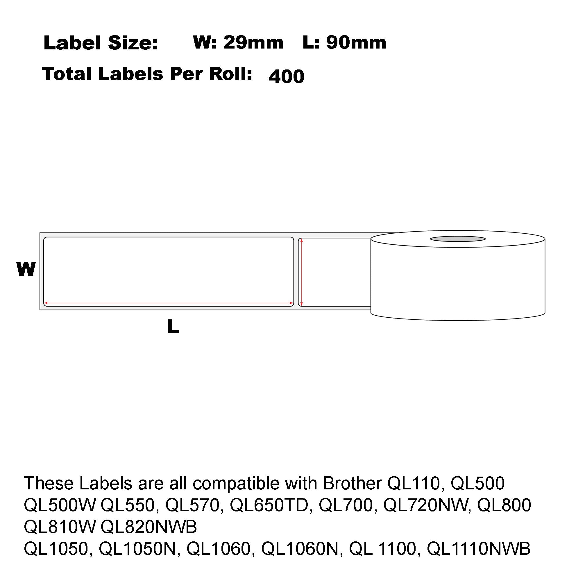 The Brother DK Labels come with Die-Cut and continuous length. Die-Cut one is pre-sized Brother labels that are pre-cut into label shapes and sizes commonly used in mailing and administrative application. And continuous Brother label tape length is flexible, but width is fixed.