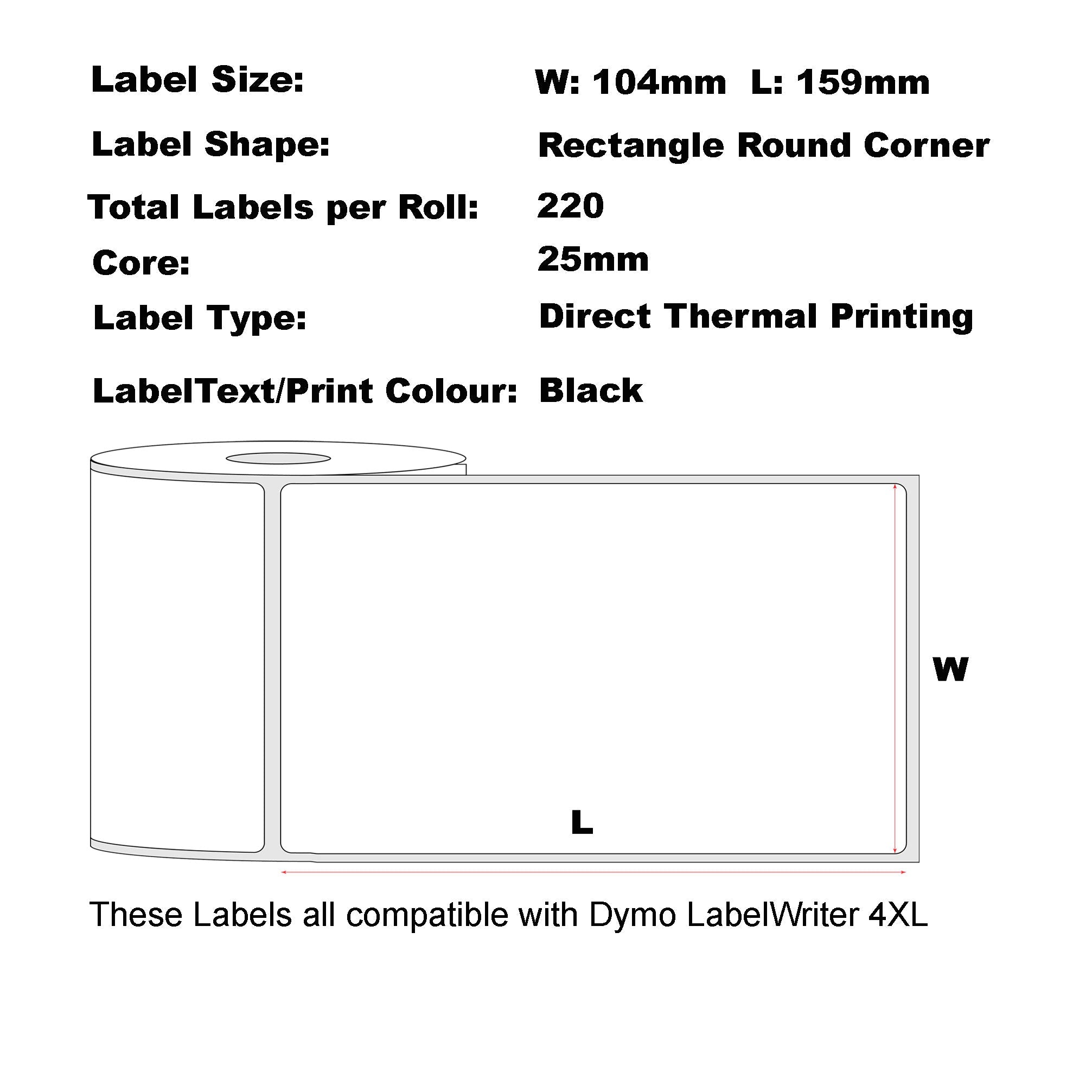 Label measures:      104mm x 159mm, 220 labels with each rolls.
