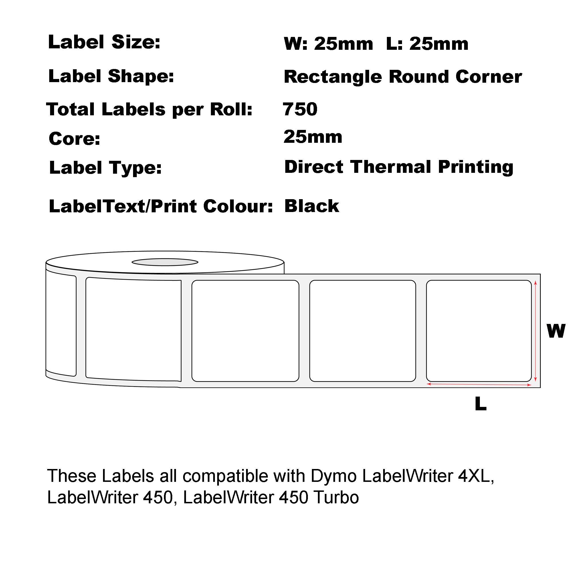 Label measures: 25mm x 25mm, 750 labels with each rolls.
