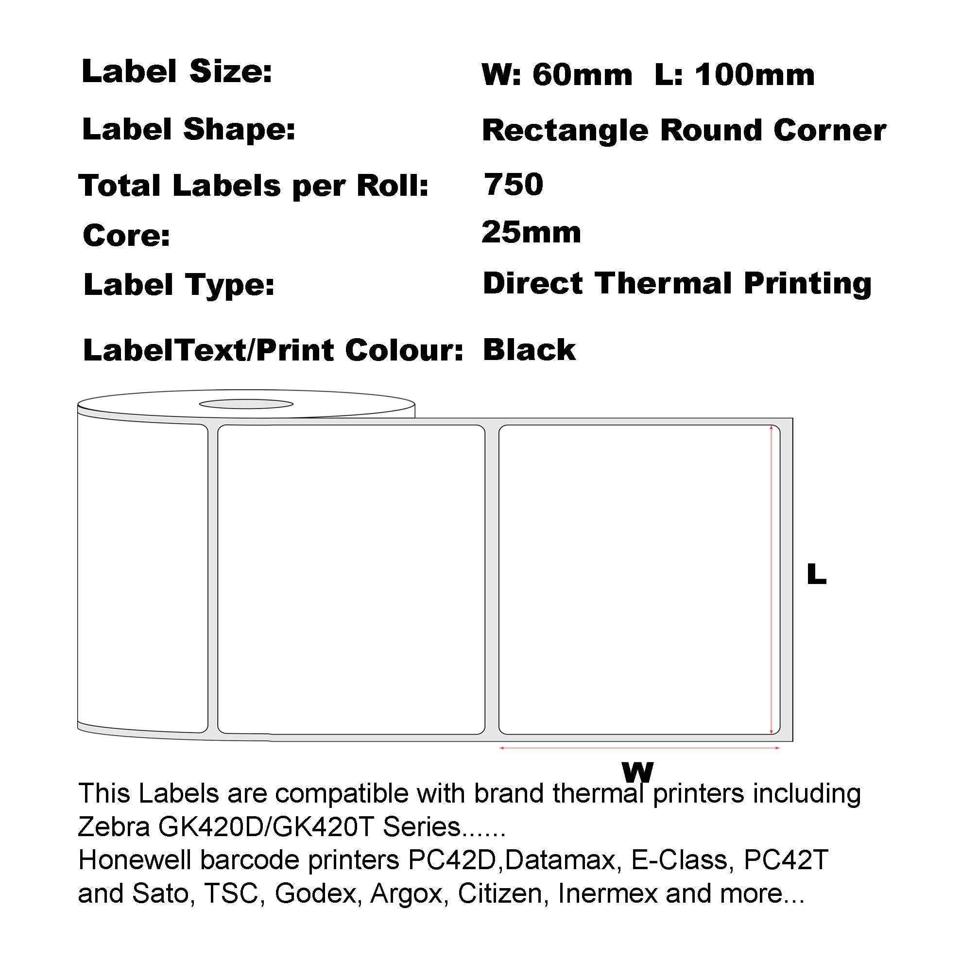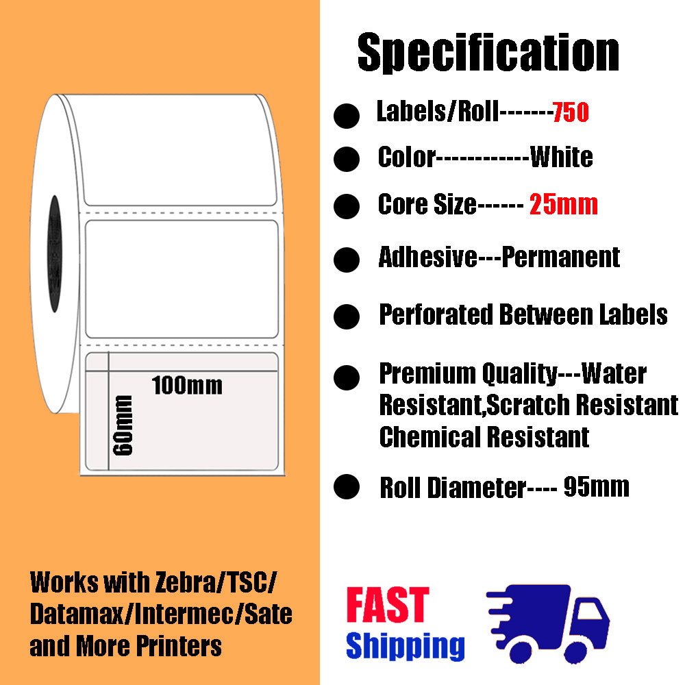 Direct thermal Perforated Label 100mm x 60mm - 750 Labels Per Roll, 25mm Core